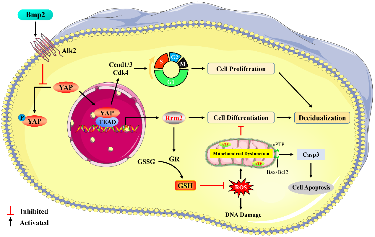 子宫蜕膜化是哺乳动物妊娠建立的关键环节,其机理十分复杂。Yap是Hippo信号通路中的关键效应因子,对卵泡和早期胚胎发育至关重要,但其在子宫蜕膜化过程中的生物学功能尚不清楚。课题组研究发现,Yap高表达于小鼠子宫蜕膜区,缺失Yap可因子宫基质细胞增殖与分化异常而导致蜕膜发育受损。Bmp2与Alk2受体结合后可促进Yap转入细胞核,通过与TEAD相互作用介导Rrm2的转录,参与DNA的损伤修复。同时,缺失Yap可因GR抗氧化酶活性减弱和GSH含量减少而引起细胞内ROS水平增加,导致线粒体功能受损,触发细胞凋亡。研究结果可为进一步阐明蜕膜化的分子机理、动物繁殖率的提高及不孕症的治疗等提供理论依据。
