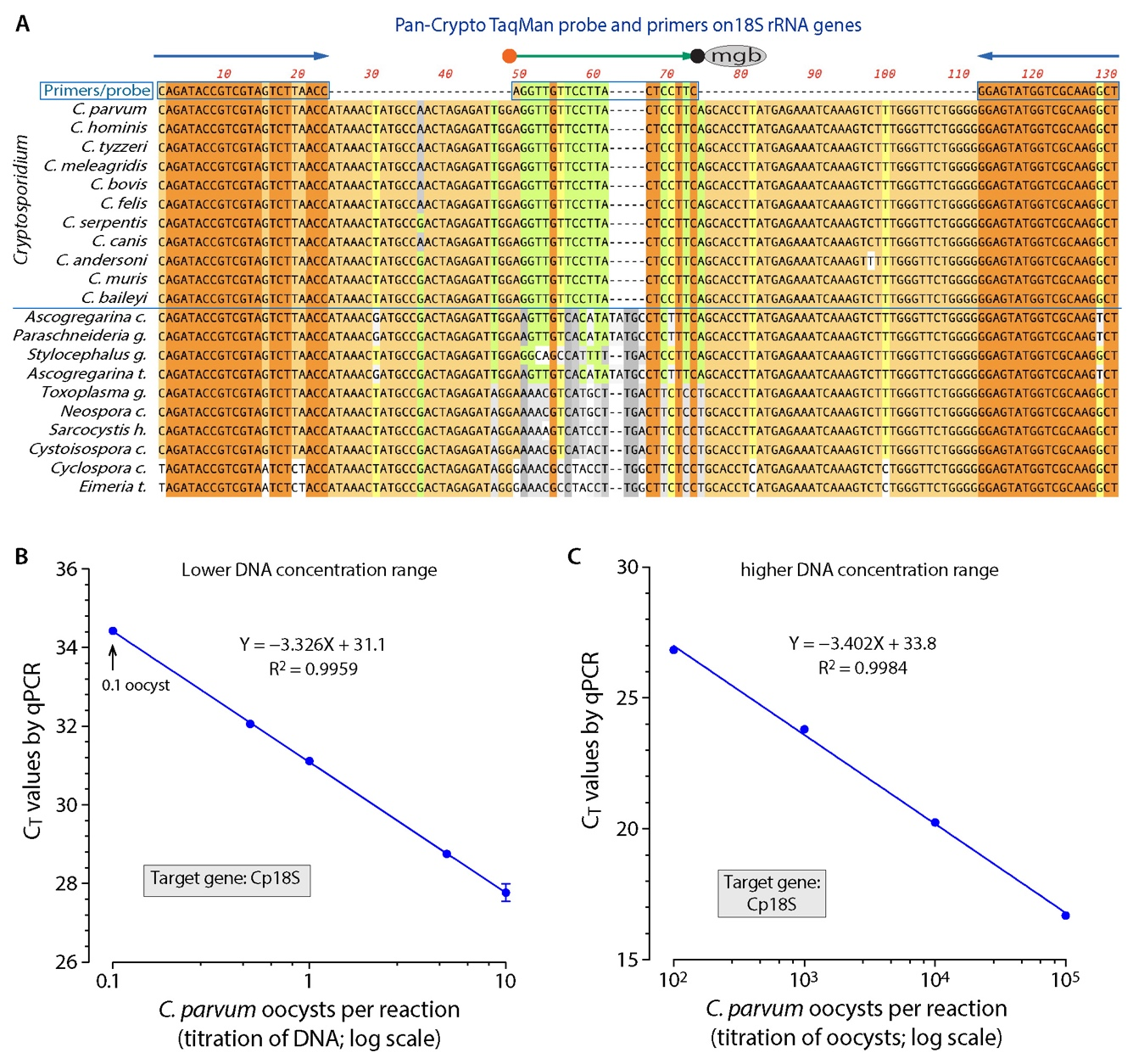 基于隐孢子虫18S rRNA基因的、可在属范围内定量检测隐孢子虫(pan-Cryptosporidium)的引物和探针设计及其技术灵敏度(图源自Water Research)