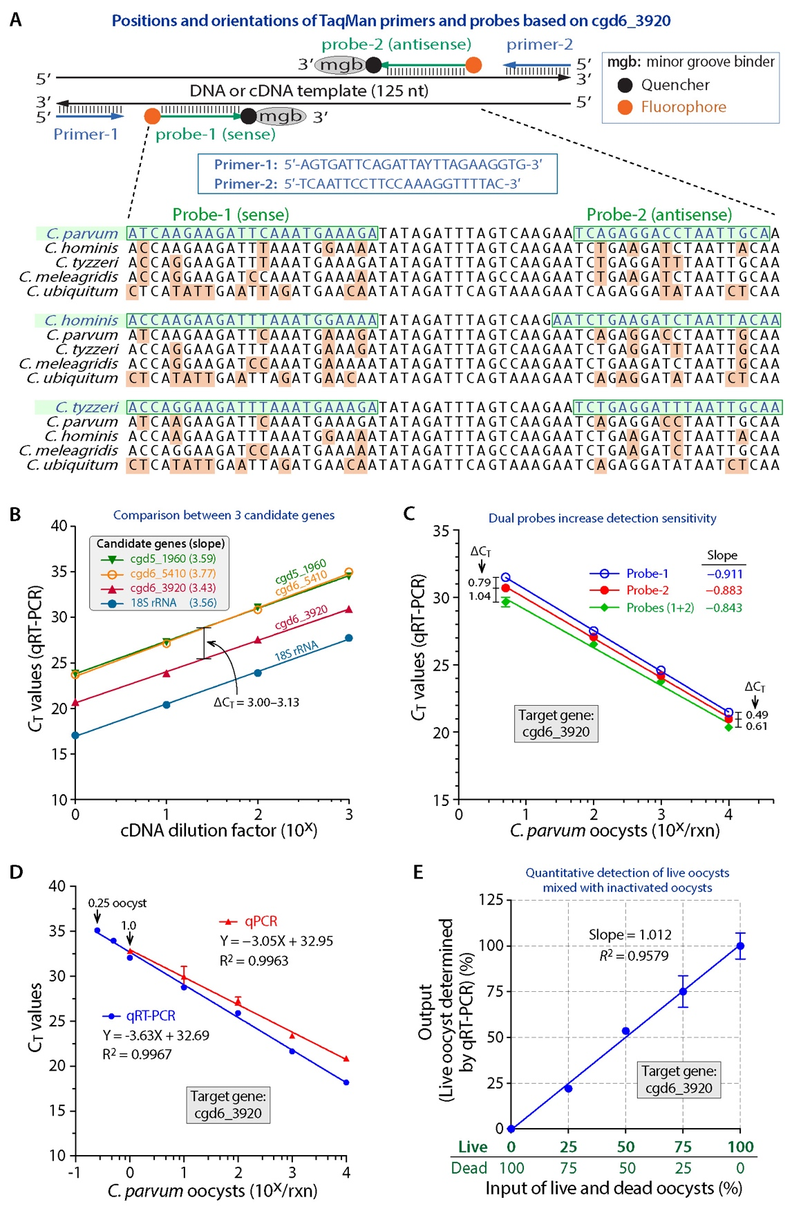 基于隐孢子虫cgd6_3920基因的定量检测RNA(活卵囊)和DNA(总卵囊)的q(RT)-PCR方法的引物和探针设计及其技术灵敏度(图源自Water Research)