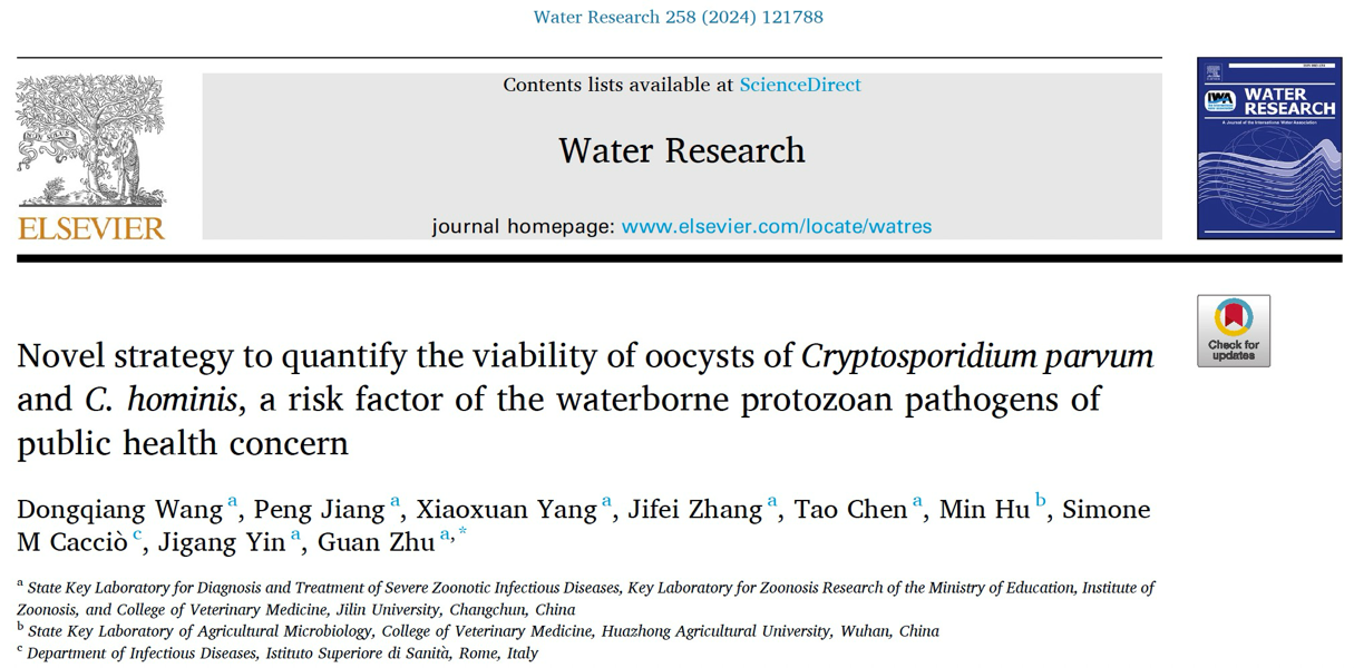 朱冠教授团队于国际水资源顶级期刊《Water Research》发表题为“Novel strategy to quantify the viability of oocysts of Cryptosporidium parvum and C. hominis, a risk factor of the waterborne protozoan pathogens of public health concern”的论文,报道了定量检测水源中隐孢子虫卵囊活力的新方法。此研究由王东强(博士生)等领衔,旨在解决现有检测方法无法灵敏有效区分隐孢子虫种类和活力的问题,以提供更准确的公共卫生风险评估手段。