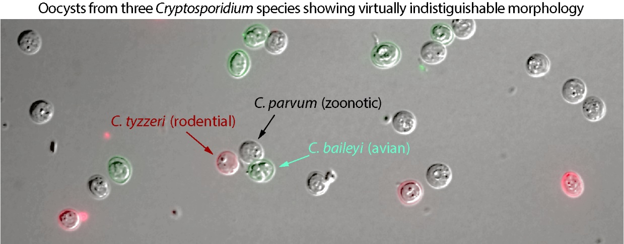 不同的隐孢子虫物种难以根据卵囊形态区分。上图为混合了三种隐孢子虫的卵囊的显微图片,其中C. parvum可感染免疫力正常的人群,而C. tyzzeri和C. baileyi仅感染鼠和禽类(图片由作者提供)