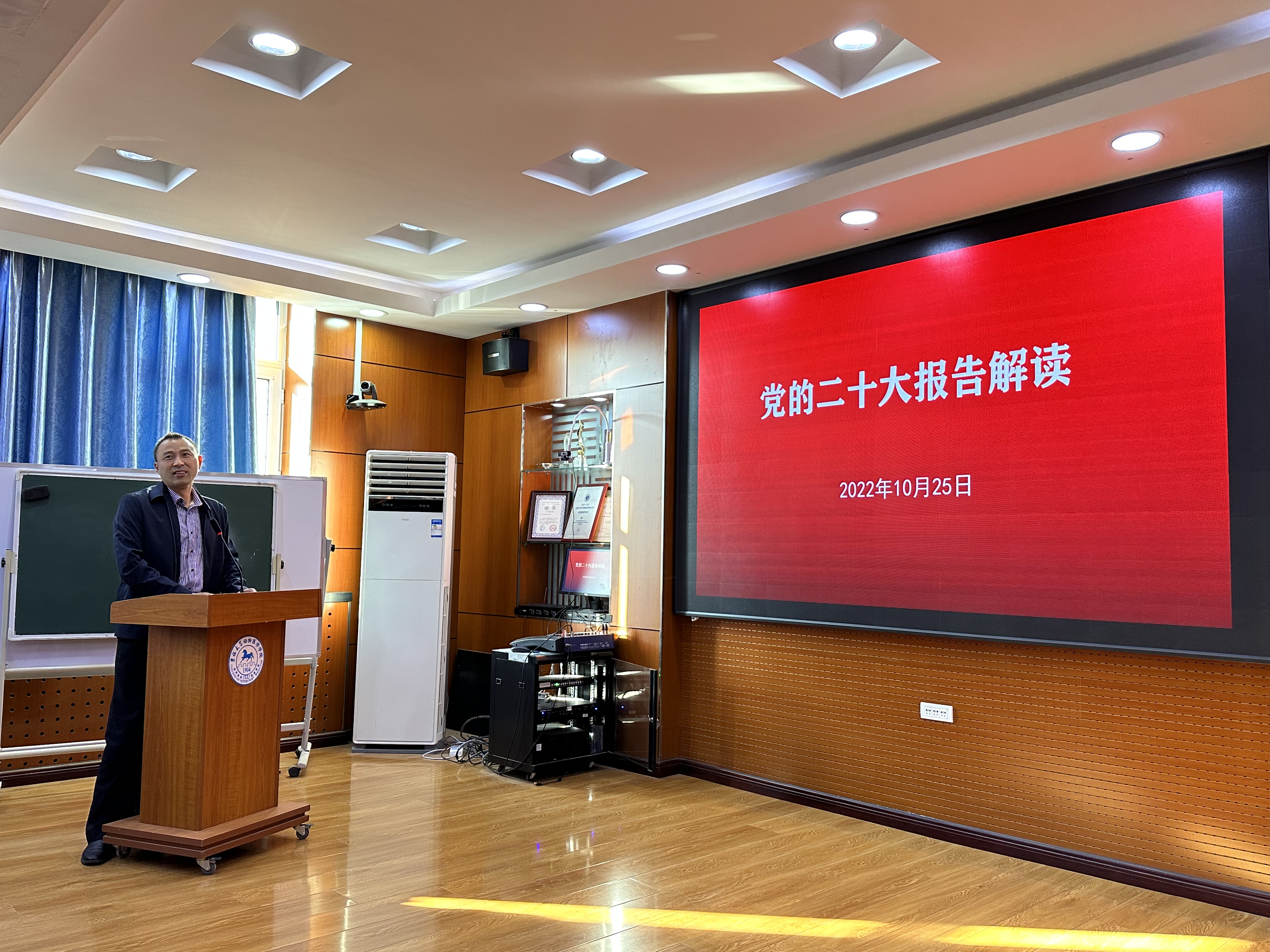 学院党委书记饶家辉同志结合自己学习体会,从党的历届代表大会的召开情况、二十大代表的构成与分布、党的二十大主要议程、习近平总书记在中国共产党第二十次全国代表大会上的报告的主要内容和核心要义等方面为与会人员详细解读党的二十大精神。着重阐释了“三个务必”“六个必须坚持”“五个必由之路”的概念和内涵以及学习宣传贯彻党的二十大精神的重大意义。他强调,学习领会党的二十大精神,必须坚持全面准确,坚持理论联系实际,深入理解内涵,精准把握外延,以习近平总书记提出的“五个牢牢把握”为切入点,不断加深对二十大报告精神的理解,从二十大报告中汲取推动发展的强大动力,一步一个脚印把党的二十大作出的重大决策部署付诸行动、见之于成效,用我们的力量为新时代新征程的伟大目标做出实际贡献。