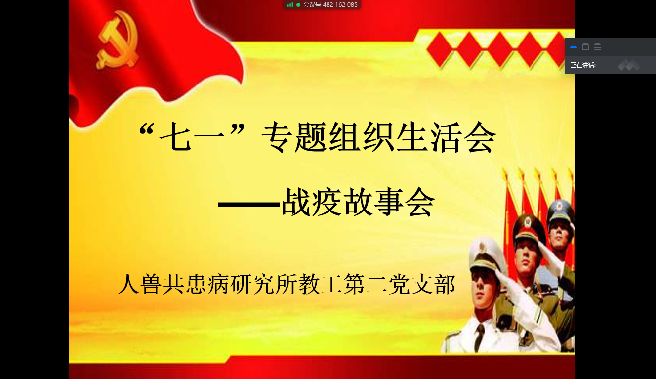 为响应党中央及校党委号召,按照教育部思政司《在常态化疫情防控中加强高校基层党建“四个一”行动方案》,人兽共患病研究所第二教工党支部于2020年7月1日下午2点,通过腾讯会议在线的形式召开了迎党的生日、讲战疫故事、悟初心使命 “七一”专题组织生活会。胡盼同志记主持会议,郭艺迪同志做会议记录。其他各位党员同志积极发言,结合会议主题说身边的战疫故事、讲切身体会。