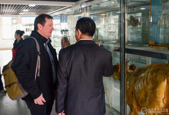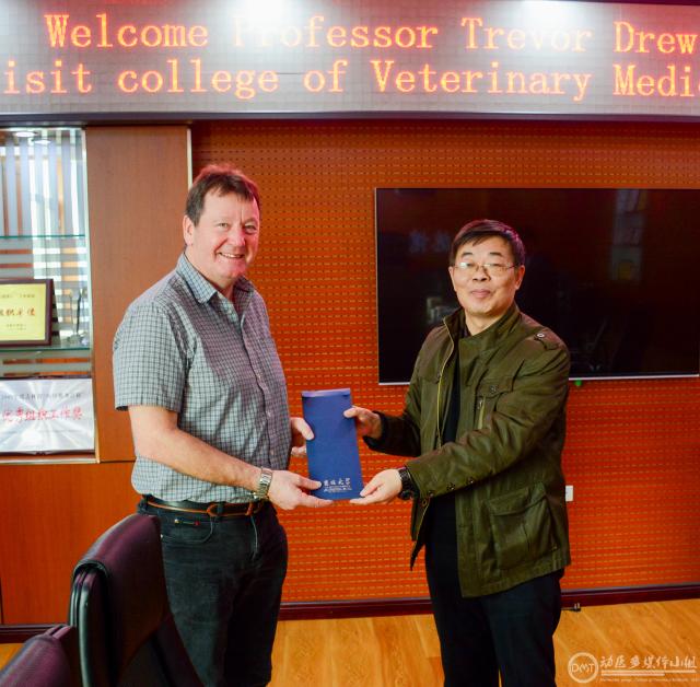 进行访问交流。常务副院长张西臣教授、教学副院长柳巨雄教授、研究生副院长雷连成教授、科研副院长刘国文教授、党委副书记饶家辉副教授、预防兽医学系主任丁壮教授、基础兽医学系宋德光教授、临床兽医学系李小兵教授、兽医公共卫生系副主任王新平教授及学校国际交流处综合科科长白茵老师与Trevor Drew教授一行进行了座谈,