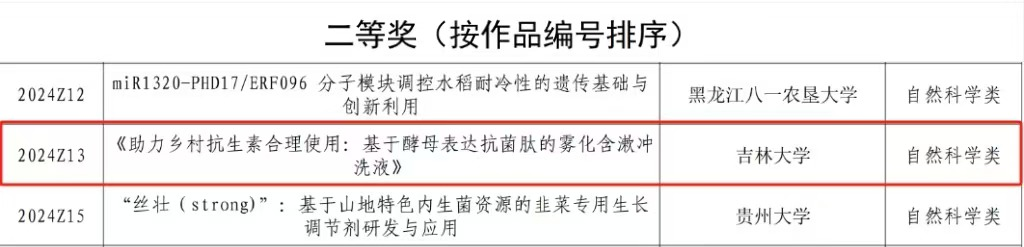 研究生科研办主任李赫老师和研究生科研办张茜老师带队、韩文瑜教授和冯新教授指导的研究生团队(曹原、张涵、刘月、柴晓东、杜晓莹、王秋霖)申报的《助力乡村抗生素合理使用——基于酵母表达抗菌肽的雾化含漱冲洗液》项目在此次竞赛中斩获自然科学组二等奖,为酷爱成人网