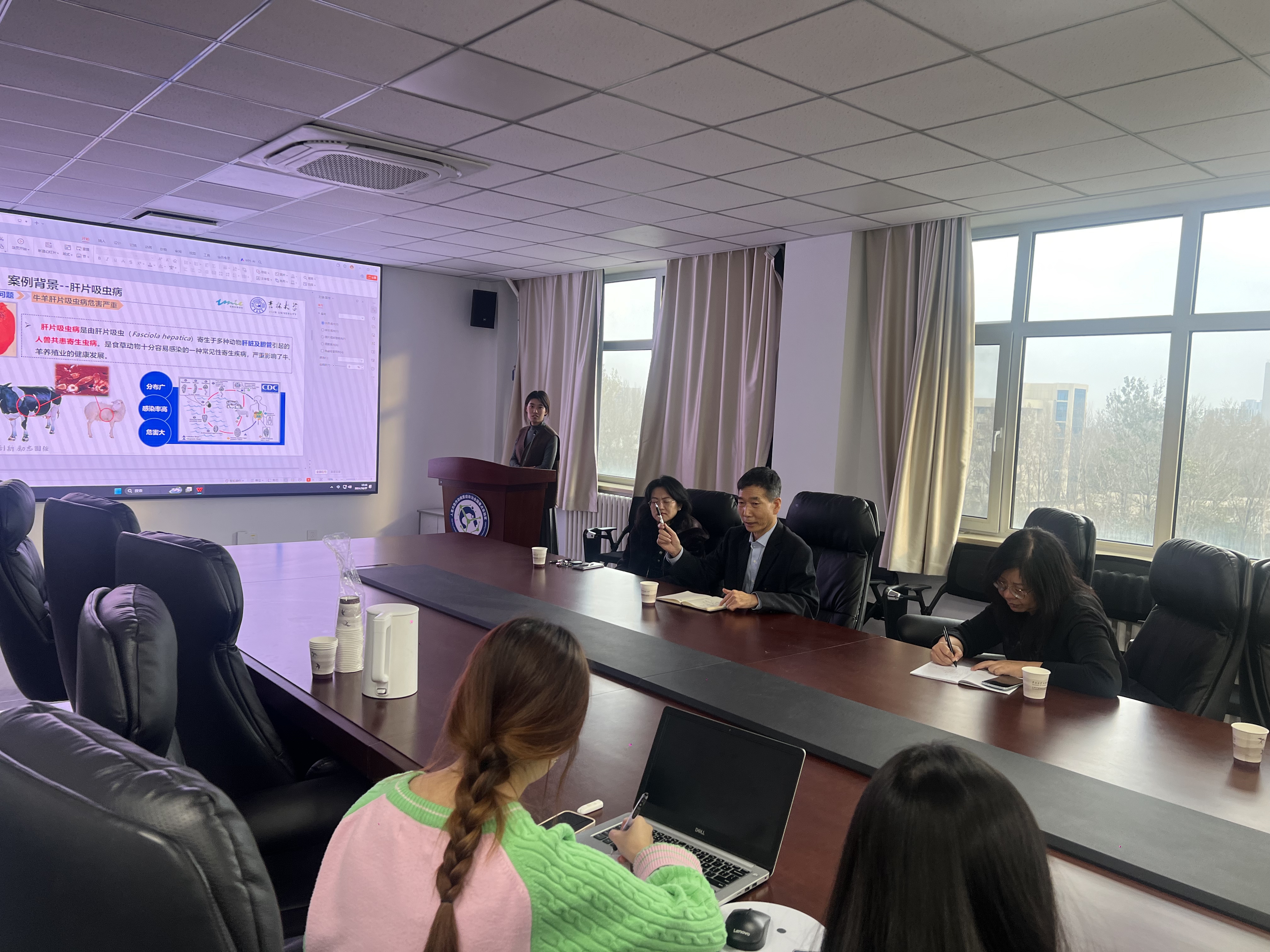 参加此次指导会的有研究生培养委员会主任雷连成教授,预防兽医学系主任冯新教授,兽医公共卫生系主任胡盼教授,研究生科研办主任李赫,以及博士研究生丁颖。
