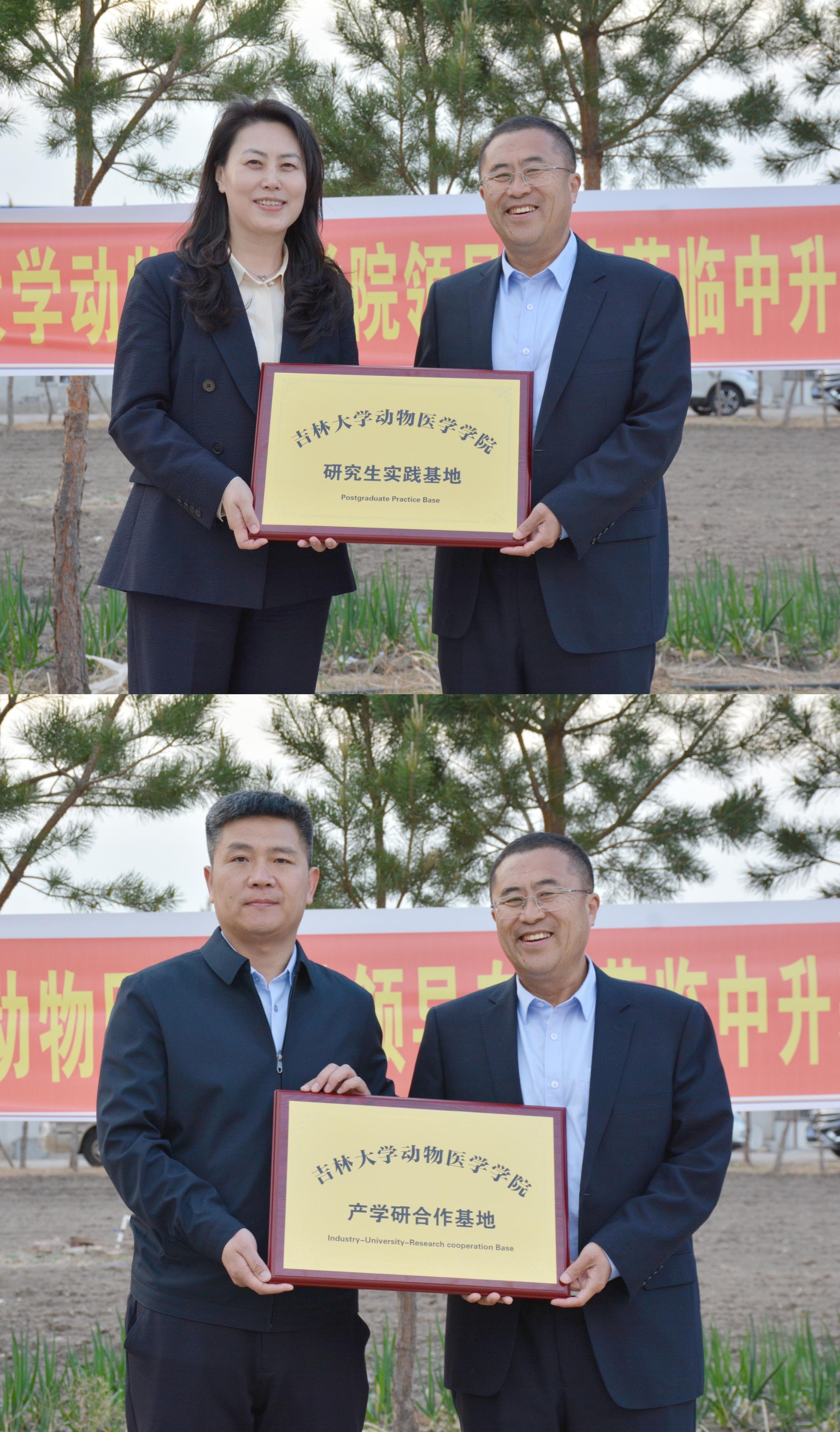 活动中,李建华院长和王化磊副院长分别为通榆中升养禽场颁发研究生实践基地和产学研合作基地牌匾。此次授牌标志着校企双方在人才培养、技术服务、科研合作等方面迈出了实质性的一步。双方将依托产学研合作基地,共同开展通榆县畜牧兽医领域的技术研发与创新,推动科技成果的转化与应用。同时,研究生实践基地的建立,将为研究生提供宝贵的实践机会,帮助同学们将理论知识与实际操作相结合,提升综合素质和实践能力。